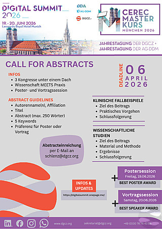 In der jährlichen Ausschreibung werden wissenschaftliche Arbeiten sowie Kurzvorträge, Poster und Fallpräsentationen rund um CAD/CAM, intraorale Scans, computergestützte Verfahren und die digitale Abformung gesucht.